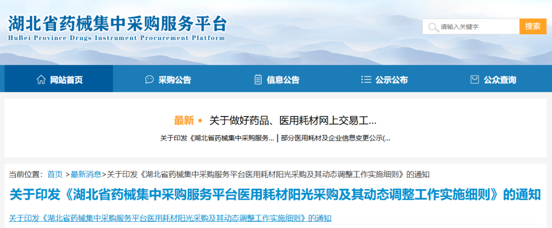 11月19日,湖北省药械集中采购服务平台发布《湖北省药械集中采购服务平台医用耗材阳光采购及其动态调整工作实施细则》,进一步做好医用耗材阳光采购工作。