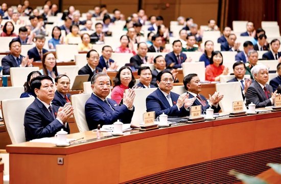 5月5日,越南河内,(左起)越南国家主席梁强、越共中央总书记苏林、越南总理范明政出席越南第十五届国会第九次会议。图/视觉中国